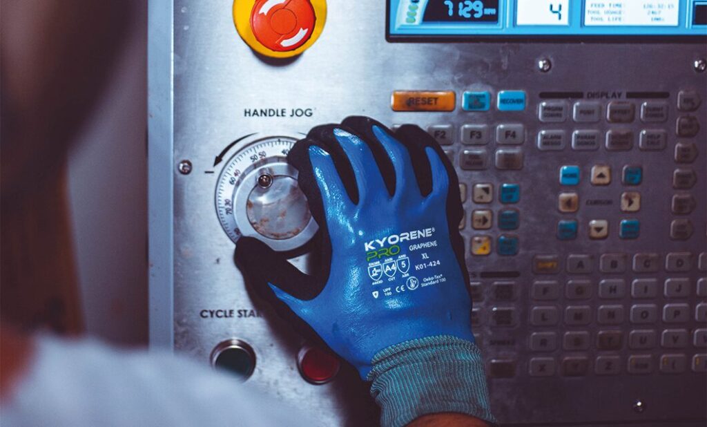 Kyorene® com sua fibra de grafeno proporciona luvas com grande resistência ao corte e à abrasão, conforme EN388, além de ótima ergonomia.